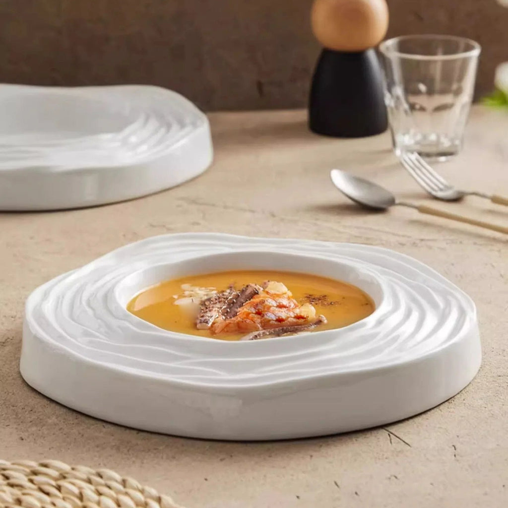 Inspired by the elegance of flowing water, this rippled ceramic plate is perfect for soups, bisques, or seafood entrées. Its glossy white glaze and sculptural rim create a stunning backdrop for vibrant dishes, adding both motion and refinement to the table. Elevate your plating with this artistic serveware, available now at platesandcutlery.com.