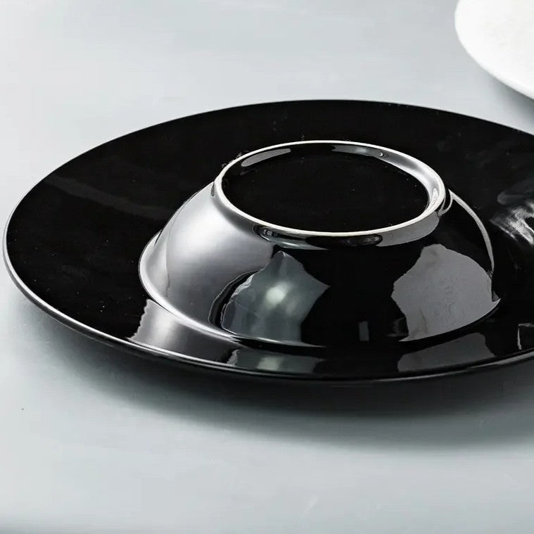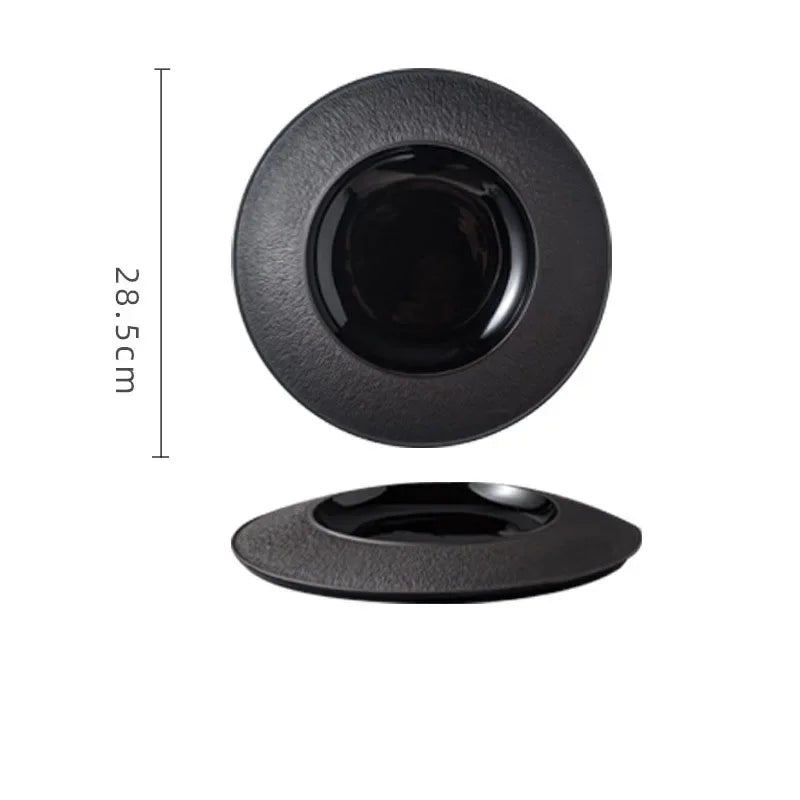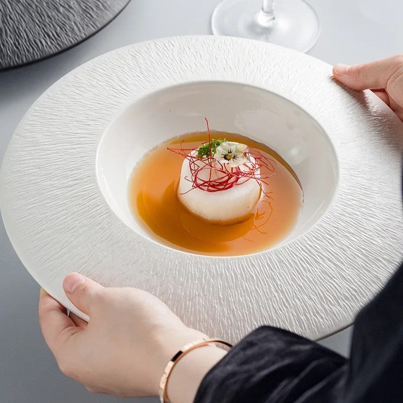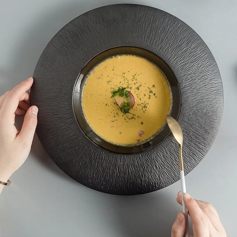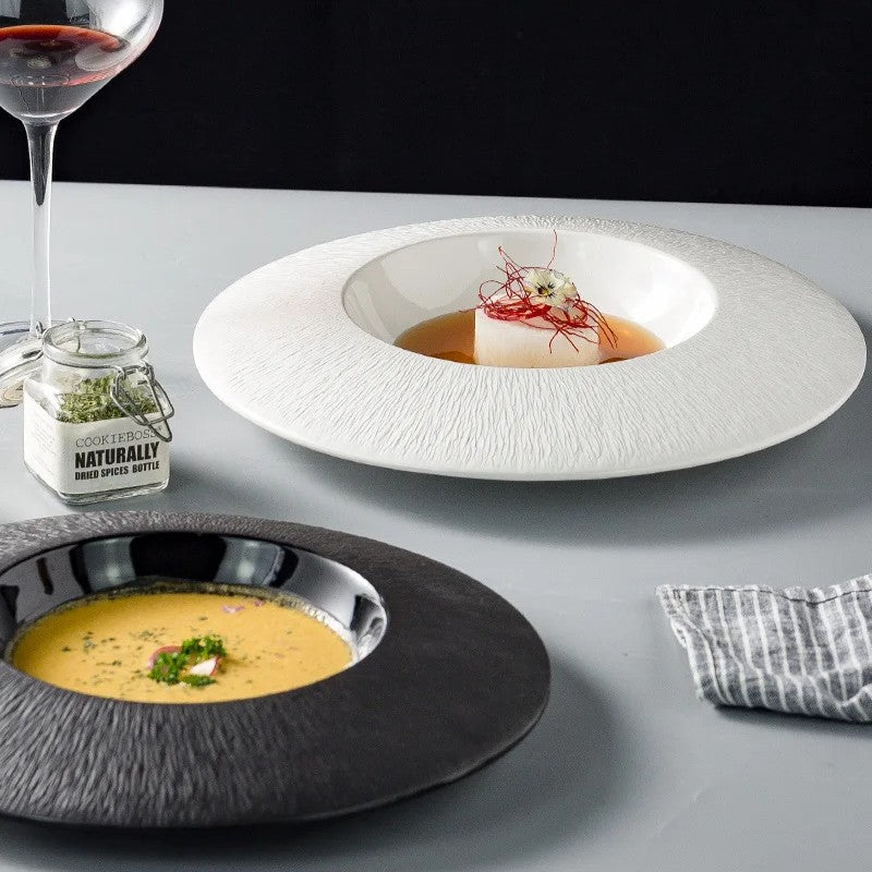 Elevate your soup presentations with this premium textured-rim ceramic plate. Designed for elegant dining, its etched matte border contrasts a glossy centre, ideal for broths, ravioli, or artistic liquid plating. A favourite for Michelin-style service and creative chefs. Available now at platesandcutlery.com – where presentation meets perfection.