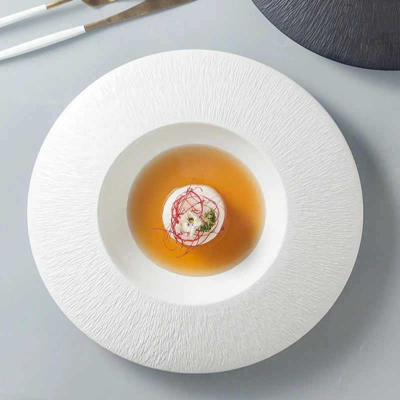 This elegant deep-rimmed ceramic soup plate features a wide, flat rim with a delicately etched bark-like texture, adding a refined, organic character. The central well is perfectly recessed, ideal for serving broths, consommés, and other liquid-based fine dishes, while the elevated edge ensures clean presentation and controlled plating.