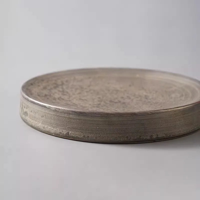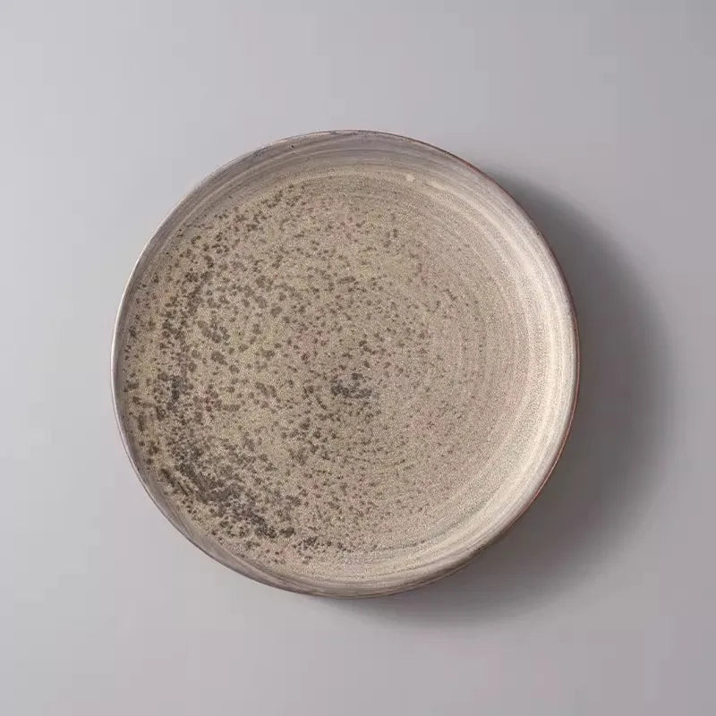 The surface is finished with a hand-brushed spiral pattern that swirls inward, creating a hypnotic centerpiece effect. Subtle glaze variations and speckled edges give the plate a tactile, stone-like quality—each piece appearing slightly unique and intentionally imperfect.