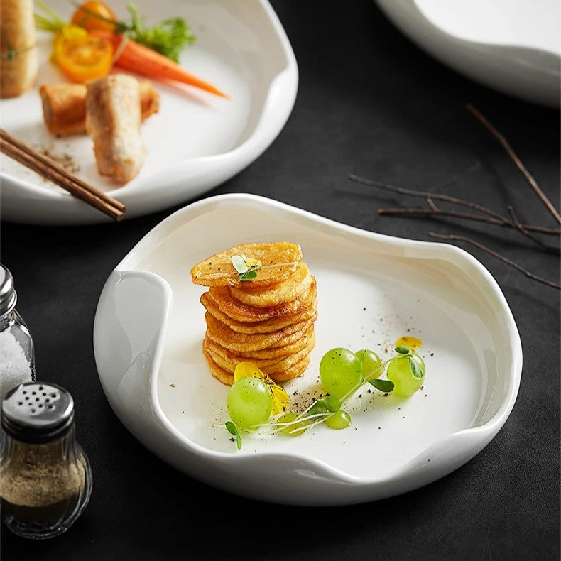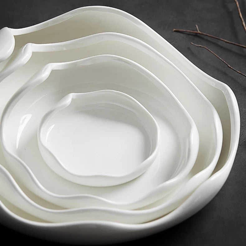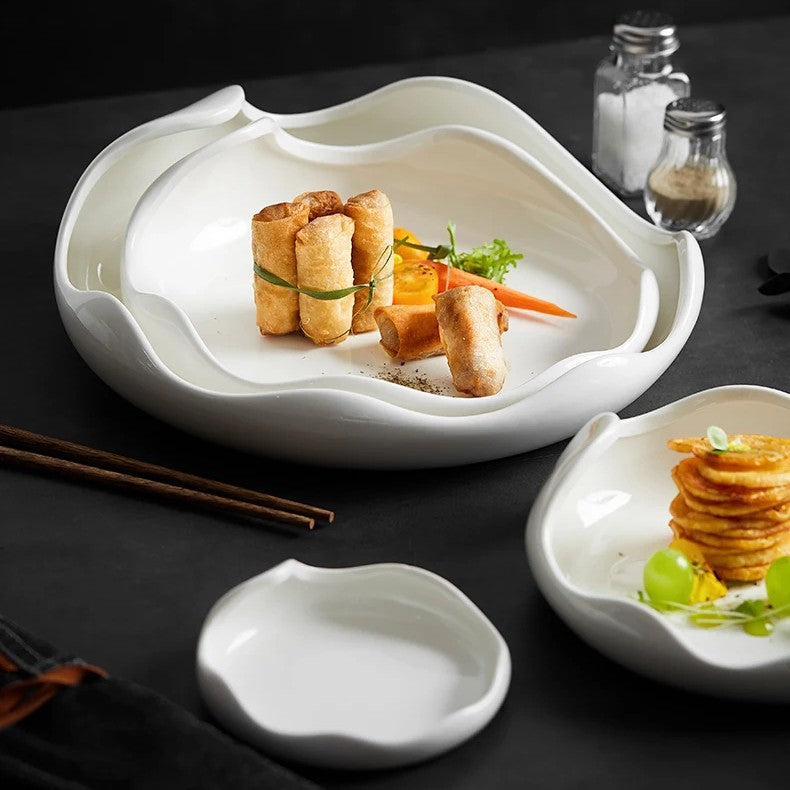 Serve in style with these organically shaped white ceramic plates, perfect for artistic plating and food sharing. Their wavy rims and nesting form add sculptural elegance to any table. Ideal for appetizers, sushi, or modern tapas. A sophisticated choice for chefs, stylists, or dinner hosts. Discover unique dinnerware now at platesandcutlery.com.