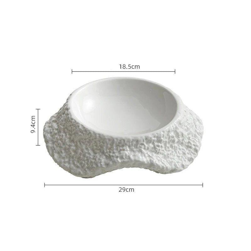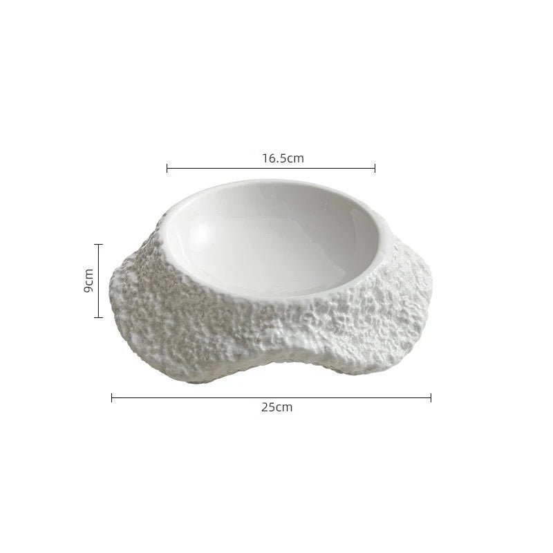 This sculptural ceramic bowl features an asymmetric, crater-like form inspired by natural rock formations. Its wide, curved basin nestles within a thick, rugged base, making it both a statement piece and a functional vessel for soups, pastas, or creative entrées in fine dining.
