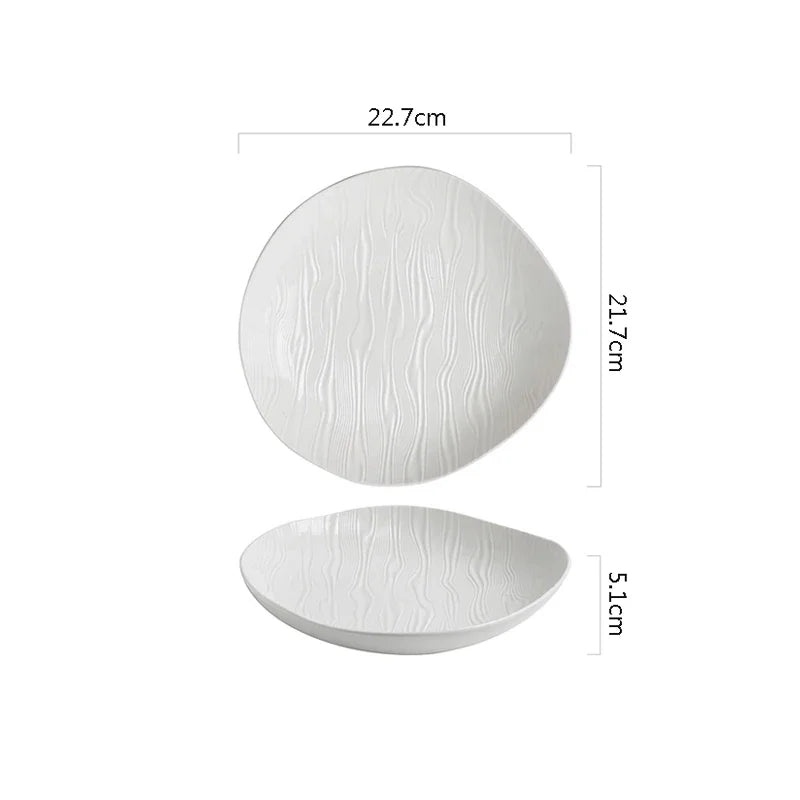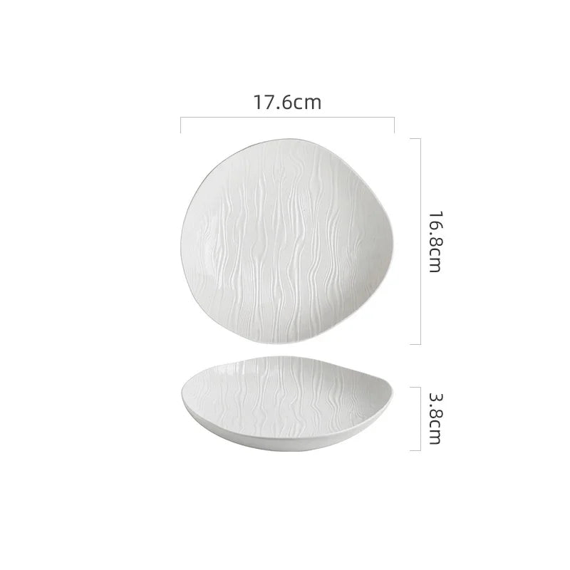 This square-meets-round ceramic plate features a softly curved silhouette with elegantly raised wave textures radiating outward. The gentle undulations give a sense of fluid motion, reminiscent of rippling water or sand dunes—perfect for nature-inspired, minimalist, or refined plating styles.