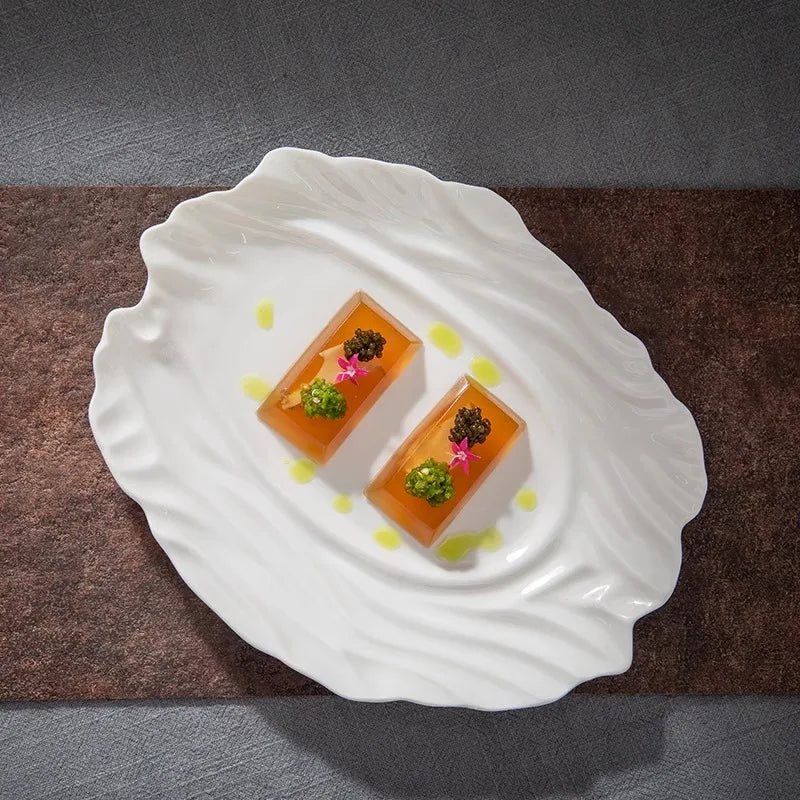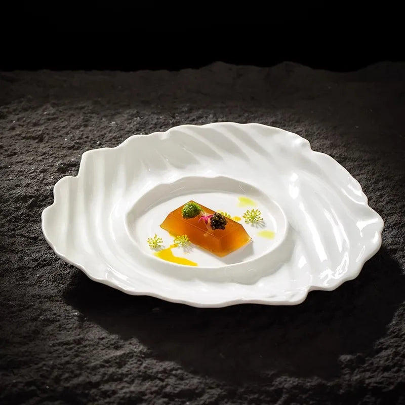 This sculptural white ceramic plate features an asymmetric, flowing design inspired by the motion of ocean waves or seashell contours. Its organically undulating rim surrounds a shallow central well, ideal for showcasing amuse-bouche, hors d'oeuvres, or delicate desserts with theatrical flair.
